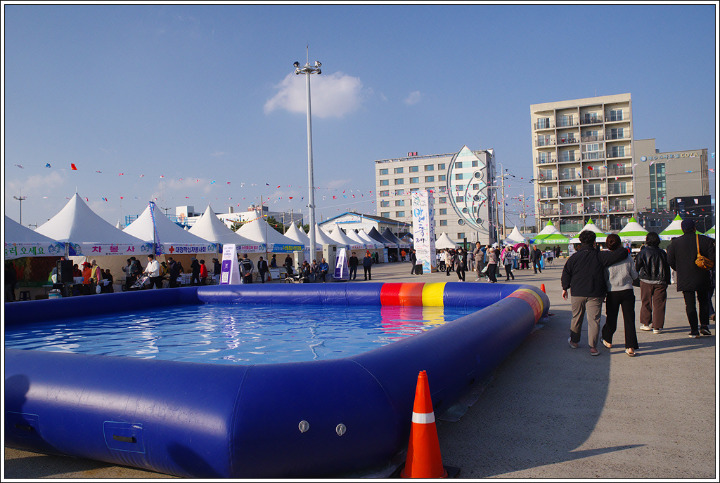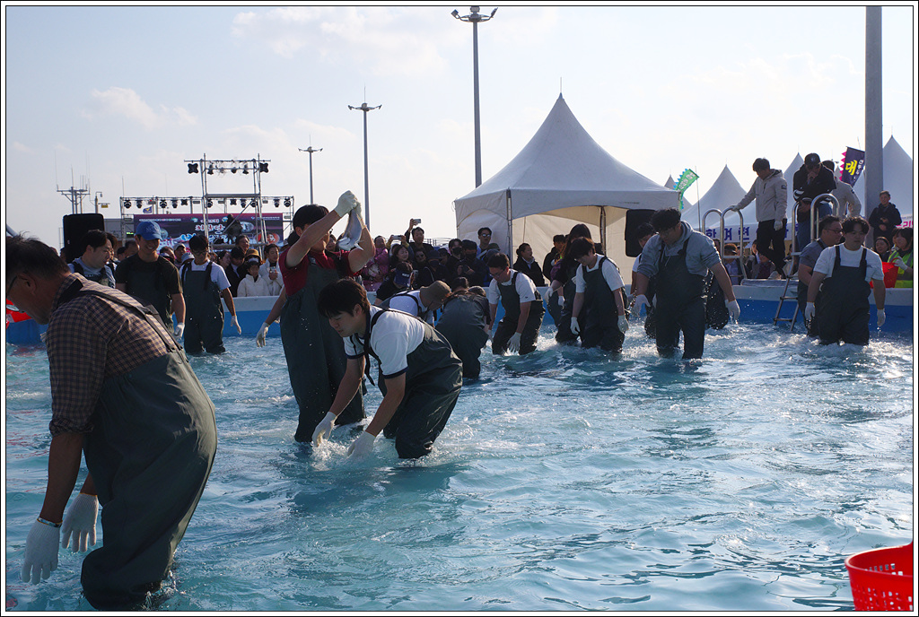 마침 방어축제가 20일 개막하여 맨손으로 방어잡이 체험을 위해 참가자들이 대기중....